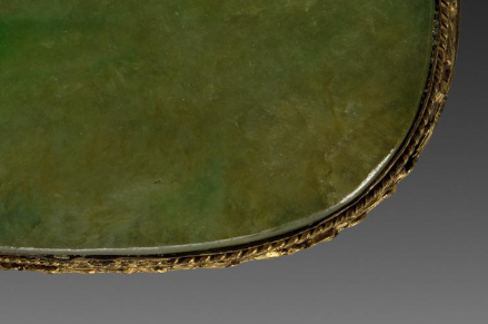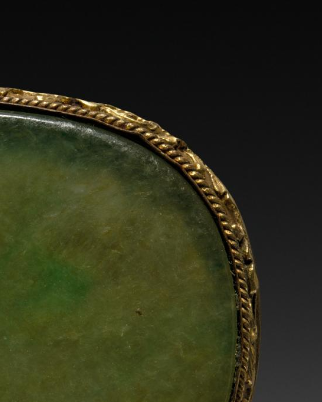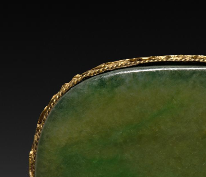 本品规格为3.9 x 5.2 厘米。主体镶嵌的是翡翠,翡翠呈现出带有绿色调的色泽,质地温润,带有玉石特有的通透感与自然纹理。外围的框架为金属材质,表面经鎏金处理,呈现出华贵的金色光泽,色泽明亮且富有质感。整体呈椭圆形,金属边框线条流畅,工艺精湛,将翡翠稳固地镶嵌其中,整体设计简洁大方,却又因翡翠的点缀而显得精致华贵,金色与翡翠的绿色相互映衬,视觉效果和谐且富有美感。