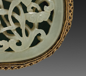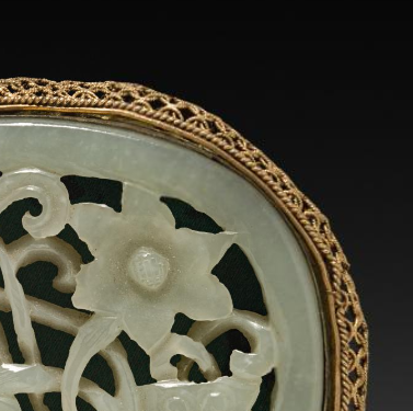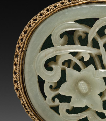 本品规格为7.4 厘米。主体部分为玉石,色泽温润,呈现出淡绿色调,质地细腻。玉石表面采用镂空雕刻工艺,雕刻出精美的花卉图案,线条流畅,花瓣、枝叶细节清晰。玉石外围包裹着鎏金的金属边框,金色璀璨,与玉石的淡雅形成鲜明对比。金属边框上采用了累丝等精细工艺,编织出复杂而精致的花纹,尽显华贵。整体呈椭圆形,造型规整。镂空花卉图案在玉石上错落有致,富有层次感,展现出高超的玉雕技艺。鎏金边框紧密贴合玉石,将玉石完美镶嵌其中,使整个带板看起来精致而典雅。