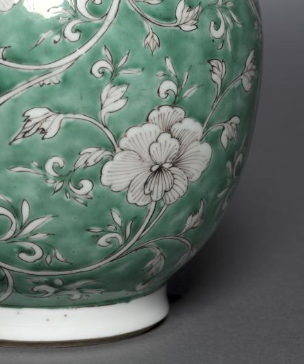 本品规格为27.3 厘米。此瓶为长颈瓶造型,颈部修长,腹部圆润饱满,底部为圈足,整体线条流畅优美。瓶身以绿色为地,采用墨彩绘制缠枝花卉纹,花卉形态各异,缠枝婉转灵动,纹饰线条细腻流畅,墨彩与绿地相互映衬,色彩搭配和谐雅致,给人一种清新且富有艺术感的视觉效果,釉面光滑莹润,尽显清代瓷器的工艺之美。