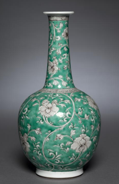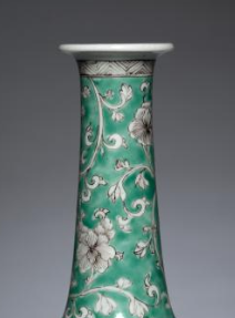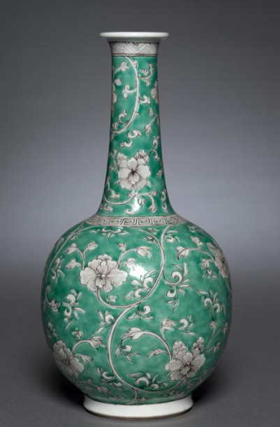 在清代,这类长颈瓶主要作为陈设器使用。它们常被放置于宫廷、贵族府邸或文人书房等场所,用于装饰空间,彰显主人的审美品味与身份地位。其精美的绿地墨彩缠枝花卉纹饰,不仅具有极高的艺术观赏性,也体现了清代陶瓷工艺的精湛水平,是清代陶瓷艺术中兼具实用与艺术价值的代表性器物。