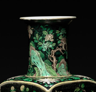 在清代时,此瓶造型端庄,墨地素三彩装饰华丽且富有艺术感,具有极高的艺术观赏性,常被放置于室内厅堂、书房等场所,作为陈设器物,起到装饰空间、彰显主人高雅审美品味的作用,是清代贵族或文人阶层喜爱的陈设瓷器之一。