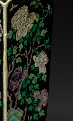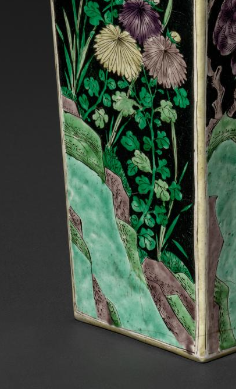 本品规格为49.2 厘米。整体呈方形瓶状,为典型的方瓶造型,口部、颈部、腹部线条规整,棱角分明,比例协调,给人一种端庄稳重的感觉。瓶身以墨色为地,绘有精美的花卉纹饰,花卉种类多样,形态各异,色彩丰富(绿、黄、紫等色)。纹饰精细,构图巧妙,将花卉的柔美与生机展现得淋漓尽致,体现了清代素三彩瓷器装饰工艺的精湛,墨地与素三彩的搭配更显纹饰的鲜明与突出。