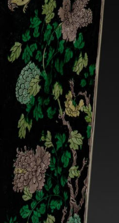 在清代时,此瓶造型端庄,墨地素三彩装饰华丽且富有艺术感,具有极高的艺术观赏性,常被放置于室内厅堂、书房等场所,作为陈设器物,起到装饰空间、彰显主人高雅审美品味的作用,是清代贵族或文人阶层喜爱的陈设瓷器之一。
