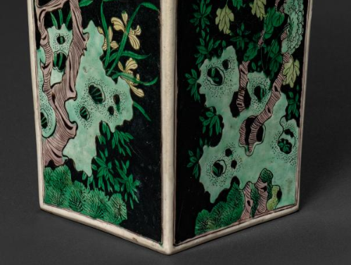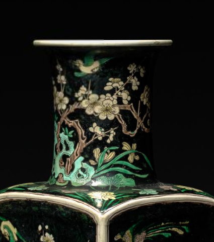 本品规格为49.2 厘米。整体呈方形瓶状,为典型的方瓶造型,口部、颈部、腹部线条规整,棱角分明,比例协调,给人一种端庄稳重的感觉。瓶身以墨色为地,绘有精美的花鸟纹饰,花鸟形态生动,色彩丰富(绿、黄、紫等色)。纹饰精细,构图巧妙,将花鸟的灵动与生机展现得淋漓尽致,体现了清代素三彩瓷器装饰工艺的精湛,墨地与素三彩的搭配更显纹饰的鲜明与突出。