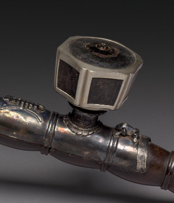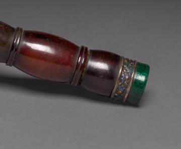本品规格为59.8 厘米。烟杆主体为木质,呈现出深沉的红褐色,木质纹理清晰,质地温润,尽显木材的天然质感。烟锅部分为八棱形状,材质似银,表面带有岁月留下的氧化痕迹,增添了古朴的韵味。烟杆两端镶嵌有绿色的玉石或琉璃等材质的部件,与木质和银质部分相互映衬,色彩搭配和谐,提升了整体的精致感。烟杆整体修长,杆身呈竹节状,富有韵律感。八棱形的烟锅造型独特,与修长的木质烟杆搭配,既符合实用需求,又具有一定的装饰性,展现出简洁而不失精巧的工艺美感。