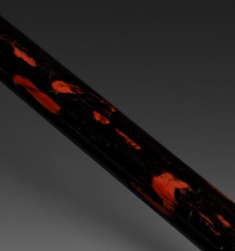 本品规格为43.2 厘米。烟杆主体为木质,表面髹有黑漆,漆色乌黑发亮,且带有自然的红色斑纹,形成独特的视觉效果,展现出漆艺的质感与韵味。烟锅部分为绿釉瓷质,釉色鲜亮,质地温润,带有瓷器的光泽与细腻感。在烟杆与烟锅的连接处,有金属部件进行衔接,金属部件色泽古朴,与漆杆和绿釉瓷烟锅相互映衬,增添了器物的精美感。烟杆的一端镶嵌有绿色的材质,可能是玉石或琉璃,与绿釉瓷烟锅颜色相呼应,整体搭配和谐。烟杆整体修长笔直,符合烟杆的实用造型需求。绿釉瓷烟锅造型独特,与修长的漆杆搭配,既保留了烟杆的实用性,又因绿釉瓷的鲜亮色泽和漆杆的独特斑纹,增添了华丽的装饰性,整体造型别致,工艺精巧。