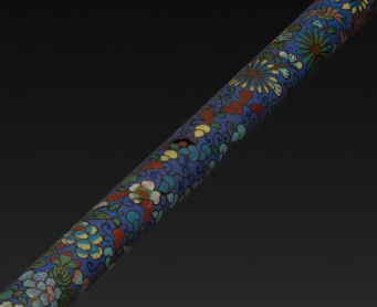 本品规格为57.5 厘米。烟杆主体部分采用金属材质,表面施以掐丝珐琅工艺。烟嘴部分疑似为象牙材质,呈现出淡黄色泽 。整体呈细长杆状。烟杆通体以蓝色珐琅为底色,运用掐丝工艺勾勒出花卉图案,包括盛开的花朵、卷曲的枝叶等,色彩丰富,有红、黄、白、绿等多种颜色,花朵形态逼真,枝叶线条流畅,展现出细腻精美的工艺。烟杆与烟锅的连接处,有精致的金属装饰,上面雕刻有花纹,增添了整体的华丽感。