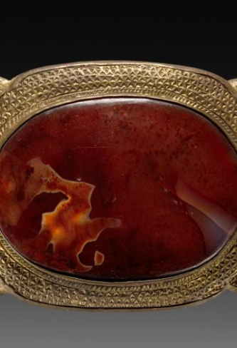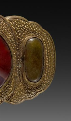 本品规格为9.3厘米。整体呈长条形,设计规整且富有对称美感。带扣主体边缘为曲线轮廓,线条流畅柔和,给人精致优雅的感觉。主体材质为金属,表面经过鎏金处理,呈现出耀眼的金黄色泽,彰显华贵。带扣中央镶嵌一块较大的玛瑙,玛瑙色泽浓郁,红中带有自然的纹理和斑块,如同天然的画卷,极具观赏性。两侧对称镶嵌有翡翠,翡翠呈现出温润的绿色,与中央玛瑙的红色形成鲜明对比,色彩搭配和谐又富有层次感。 金属边缘部分雕刻有细密的花纹,可能是传统的吉祥纹饰,如回纹、云纹等,工艺精湛,细节丰富,展现出清代高超的金属工艺水平。