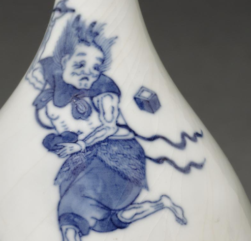 本品规格为16 厘米。该玉壶春瓶造型优美,口部呈喇叭状,颈部修长,腹部圆润饱满,底部为圈足,整体线条流畅自然,富有韵律感。瓶身以白瓷为胎,施白釉,釉面有细碎的开片纹,增添了古朴之感。以青花绘制魁星点斗的图案,画面中魁星形态生动,一脚踩着鳌鱼,一手持笔,仿佛正要点中斗魁,周围辅以海浪纹等,青花发色淡雅,纹饰细腻传神,将魁星的形象与场景展现得淋漓尽致。