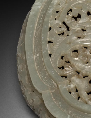 由青玉制成,玉质温润细腻,呈现出柔和的青色调,带有玉石特有的光泽,给人一种典雅之感。整体呈椭圆形,分为上下两部分,上部为镂空的盖,下部为盛放香料的容器。盖面采用镂空工艺,雕刻有精美的花卉纹样,花卉枝叶缠绕,形态逼真,线条流畅自然,展现出清代玉雕工艺的精湛技艺。容器部分也有相应的雕刻装饰,与盖面的花卉纹相呼应,整体造型和谐统一。