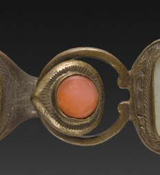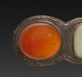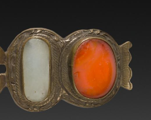 本品规格为11.5 厘米。带扣整体呈长条形,由多个部件组合而成,结构精巧,部件间通过金属构件连接,方便扣合与佩戴。主体为铜质,表面经鎏金处理,虽历经岁月,部分金层有所磨损,但仍能透出华贵的金属光泽。带扣上镶嵌有玛瑙和玉石,玛瑙呈现出鲜艳的红色,色泽浓郁,质地通透;玉石为白色,温润细腻。铜质边框上雕刻有细密的花纹,工艺精湛,线条流畅,将金属的质感与宝石的光泽巧妙融合,展现出清代高超的金属工艺与宝石镶嵌技艺。