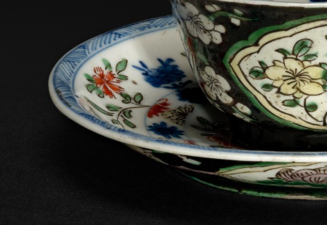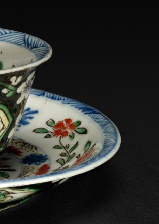 本品规格为直径12.2厘米,高度4.1厘米。以瓷为胎,胎质细腻。表面施五彩釉,色彩丰富,有红、蓝、绿、黄、紫等多种颜色,色彩搭配鲜艳且和谐,釉面光泽亮丽,尽显五彩瓷器的绚丽特色。由杯和碟组成,杯为敞口,深腹,造型规整;碟为浅盘状,与杯相配合,整体造型简洁实用,符合日常杯碟的使用需求,同时线条流畅,给人一种雅致的感觉。杯和碟上都绘有精美的花卉纹饰,花卉种类多样,形态各异,色彩丰富。杯身以深色为地,开窗绘制花卉,碟面也布满花卉图案,纹饰精细,构图巧妙,体现了清代五彩瓷器装饰工艺的精湛,将花卉的柔美与生机展现得淋漓尽致。