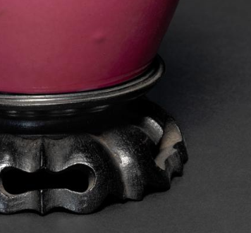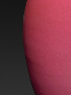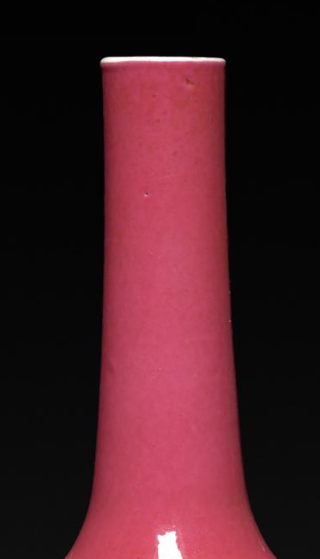 本品规格为23 厘米。整体呈直颈瓶造型,颈部修长且笔直,线条挺拔利落;腹部圆润饱满,与修长的直颈形成鲜明对比,富有层次感与韵律感;底部配有特制的底座,底座造型精巧,与瓶身搭配,使整体造型更显端庄稳重且富有艺术气息。以瓷土为胎,施胭脂红釉。瓷胎细腻,坚实厚重。胭脂红釉色泽浓郁鲜艳,如胭脂般红润,釉面光滑莹润,质感细腻,仿佛玉石般温润,给人华贵且雅致的视觉感受。