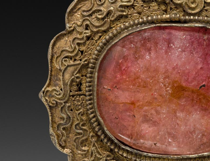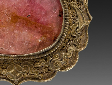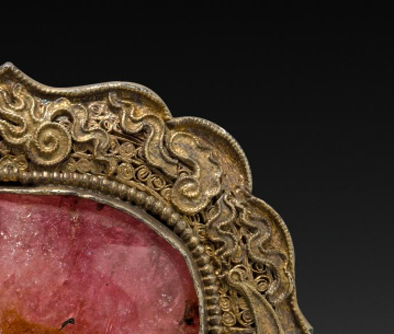 主体采用银质,表面经鎏金处理,呈现出华贵的金色光泽。带扣中心镶嵌着一块较大的碧玺,碧玺呈现出粉色调,质地通透,带有自然的纹理与光泽,与银鎏金的框架相互映衬,视觉效果华丽。银质部分运用了累丝工艺,编织出精美的花纹,工艺精湛,线条细腻流畅,展现出复杂而精致的图案。带扣整体造型呈花瓣形或异形,边缘设计独特,将碧玺稳固地镶嵌其中,整体设计既具有工艺美感,又凸显出碧玺的珍贵。