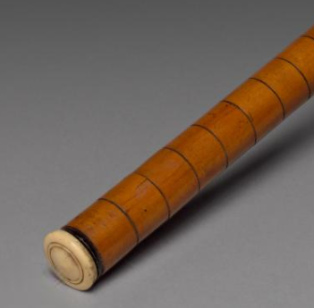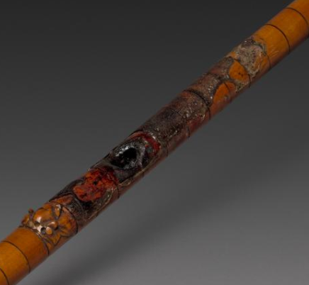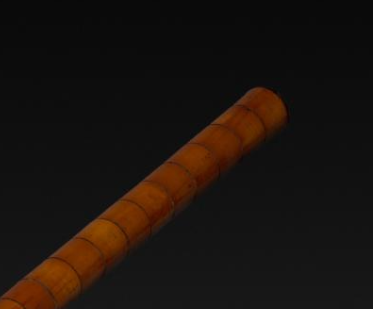 烟杆主体为木质,呈现出温润的棕黄色,表面带有自然的纹理,质感细腻。烟杆模仿竹节的形态,一节节的构造清晰可见,富有韵律感。烟杆上有一处装饰部件,带有红色等色彩,可能是通过漆绘或镶嵌工艺制作,为整体质朴的烟杆增添了色彩与工艺感。烟杆整体修长笔直,竹节造型的设计不仅符合实用的握持需求,还展现出独特的自然美学与工艺巧思,简洁而不失雅致。