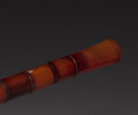 本品规格为52.8 厘米。烟杆主体为竹制,呈现出竹节的形态,竹色为红棕色,带有竹子天然的纹理与质感,尽显质朴与自然之美。烟锅部分为瓷质,瓷胎细腻,表面绘有精美的图案,色彩丰富,可能是人物、花卉等纹饰,工艺精湛,展现出瓷器的精美。连接烟杆与烟锅的部件为金属质地,表面有雕刻或錾刻的花纹,还镶嵌有宝石,增添了华贵之感。烟杆整体呈竹节状,一节节的竹节造型富有韵律与自然意趣。瓷质烟锅造型小巧,与竹节烟杆搭配,既保留了竹制烟杆的自然质朴,又因瓷质烟锅的精美图案和金属镶宝部件,增添了华丽的装饰性,整体造型独特,工艺精巧。