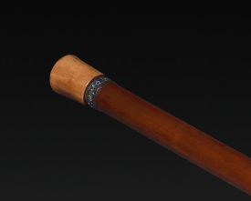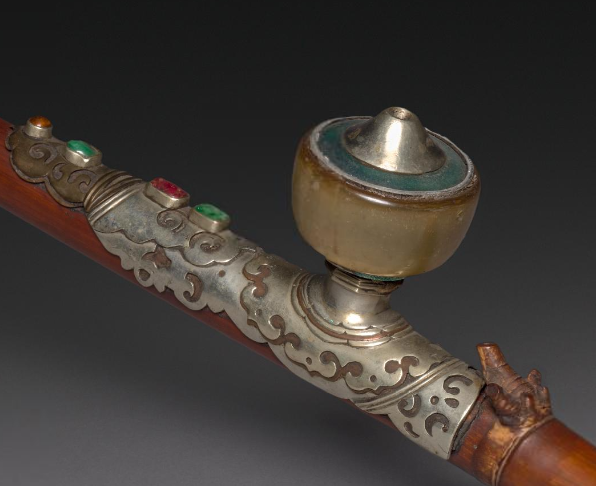 本品规格为61.6 厘米。烟杆主体为竹制,呈现出温润的棕红色,竹纹清晰,质地坚实,尽显竹子的天然质感与岁月沉淀的色泽。烟杆中部的装饰部件为银质,且表面有鎏金工艺处理,色泽亮丽,银质部件上雕刻有精美的卷云纹等纹样,工艺细腻流畅,尽显匠人的精湛技艺。同时,银质部件上镶嵌有绿色、红色等宝石,宝石色泽艳丽,在银鎏金的衬托下更显华贵,与竹质部分相互映衬,增添了器物的精美感与奢华感。烟锅部分为金属材质,表面有光泽,造型小巧。烟杆的两端镶嵌有类似骨质的部件,颜色与主体搭配和谐,进一步提升了整体的精致感。
