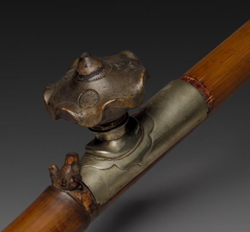 这是清代用于吸食烟草的工具。使用者将烟草放置在金属烟锅中点燃,然后通过竹质烟杆吸食产生的烟雾。