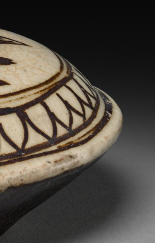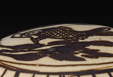 本品规格为直径12.5厘米,高度5.7厘米。整体呈扁圆形,一侧有短小的流口,便于滴水。器身线条圆润流畅,小巧精致,方便握持和使用。以黑彩绘制纹饰,盖面主体为鱼纹,鱼儿形态生动,周围辅以水藻等纹样,仿佛鱼儿在水中悠然游动,充满生机。盖面边缘还装饰有一圈几何形纹样,与主体鱼纹相呼应,整体纹饰布局精巧,绘画技法娴熟。