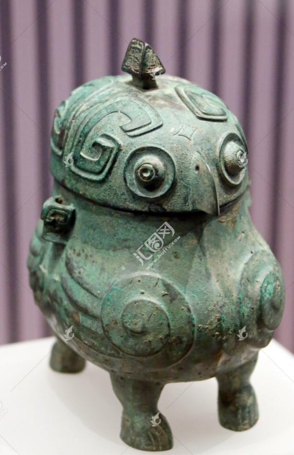 商代晚期青铜器精品。盛酒器。形如两鸮相背而立。盖为双鸮首,环目,尖喙,弯眉,盖中央置四阿顶方柱钮,饰雷纹。腹作双鸮身,子口微敛,垂鼓腹饰卷曲羽翼纹。身下为四爪,两两相背。盖腹相合,两鸮昂首背立。不仅实用,也是精美的艺术品。鸮是我国古代对猫头鹰一类鸟的统称。
