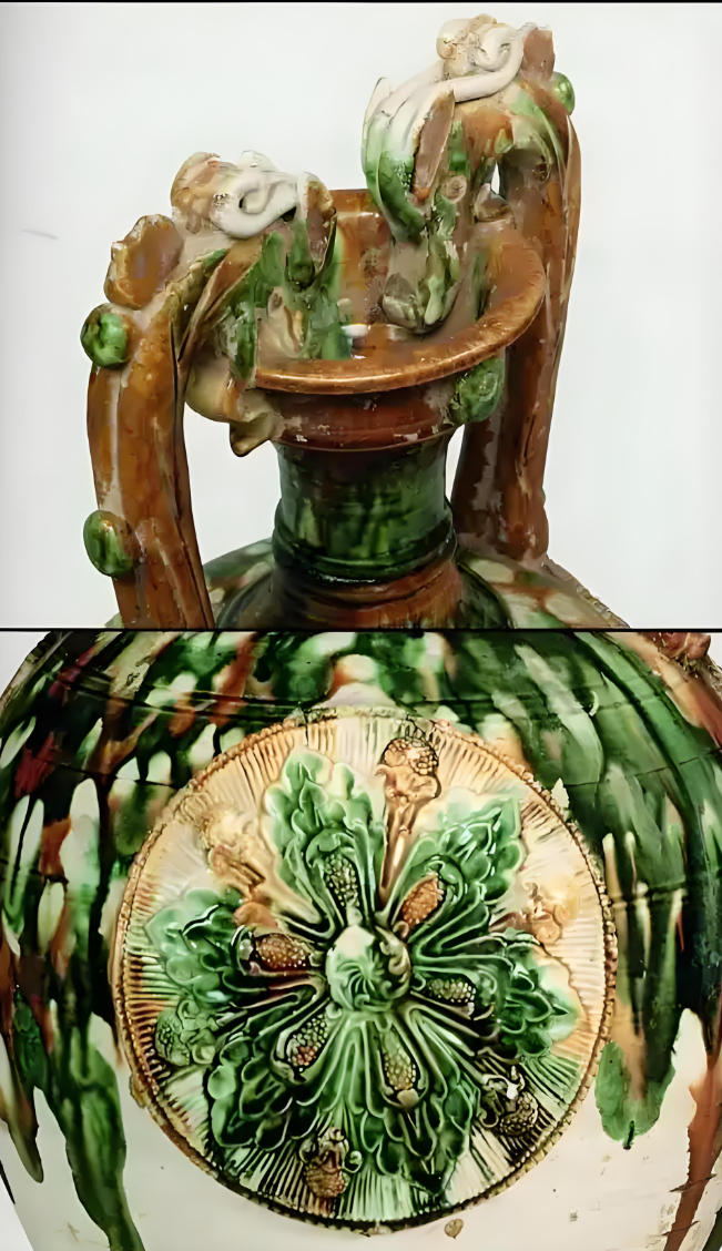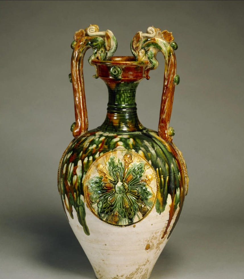 三彩龙耳瓶是中国唐代(8世纪)具有代表性的陶瓷文物,其器型融合了西方容器形态与中国传统龙形装饰,开创性地将金属工艺的圆形浮雕技法与染织品施釉工艺相结合,具有显著的时代特征。三彩龙耳瓶采用高岭土制胎,胎体经800-900℃素烧后施釉,釉料以铜、铁、钴等金属氧化物为着色剂,形成黄、绿、白三色交错流淌的视觉效果 。器物颈部两侧各塑贴一条螭龙为耳,龙首衔沿作汲水状,龙身采用模印浮雕技法形成鳞片纹理。