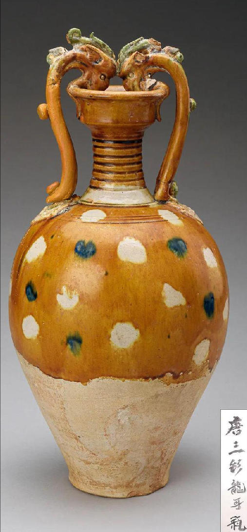 唐代三彩贴花龙耳瓶