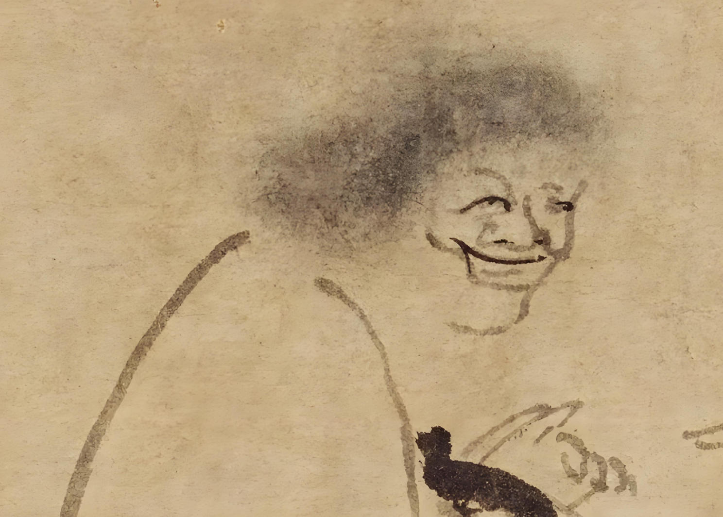 纸本墨画 纵35.2cm 横49.7cm 14世纪 东京国立博物馆 寒山与拾得,相传是住在天台山国清寺,师事于丰干禅师的唐代传奇性人物。描绘寒山、拾得的画作,自宋代以来就一直在禅借间广受喜爱。本图是描绘襄山、拾得二人被问及丰干禅师行踪时,沉默不语、只是哈哈大笑的情景。虽然因袭了将人物脸部画得细致、衣衫以粗略笔致来表现的水墨人物画传统,然而却更具有因陀罗个人独有的简略作风。