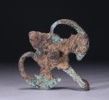 镶嵌绿松石鎏金带钩是战国时期(公元前475年-前221年)的青铜器物,器身通长25.2厘米,1965年出土于北京昌平地区。该文物采用鎏金工艺铸造,主体表面镶嵌绿松石装饰,现作为重要馆藏陈列于首都博物馆。其完整的保存状态和精美的镶嵌工艺,展现了战国时期北方地区金属加工技艺的发展水平