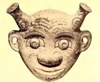 这件商代晚期的人面盉,整体为圆形,器腹外鼓,下垂,有流,敛口,盖作人面形,两耳有孔,头上有两个角,人面仰天朝上。器盖与器身连起来,如同一个仰卧的人头。器身显得较矮,在两旁近额处有两只兽面状贯耳,恰与人面双耳巧妙相对;器底圈足边镂三孔,一孔在流之下,其他两孔分别在盖耳和贯耳之下,可用系深以系绳提携。在腹部和器盖的两角之间,主要饰有商代常见的龙纹,圈足上则铸饰云雷纹。人面盉盖的后脑勺有一条蟠卷而下的龙体或蛇体,与盖子的人面连为一体,盉的颈部两侧可以看到两个龙爪,所以人面盉的整体造型应该是“人面龙身”或者“人面蛇身”。这件人面盉形制极为独特,风格奇谲怪异,尤其是夸张的人面,格外引人注目,体现出浓郁的神秘气息,为海内外所仅见。