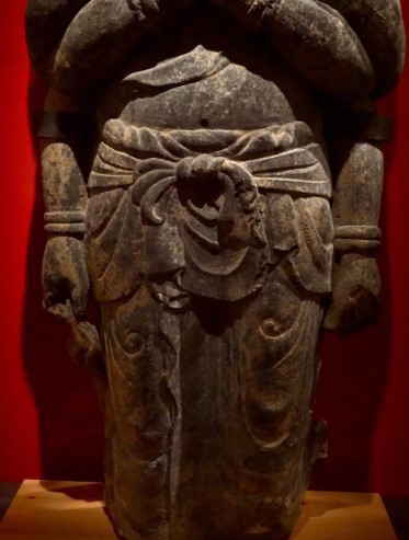 正面为观音(左)与大势至菩萨(右)立像,高约1.2米,头戴宝冠,面容丰腴,手持莲蕾与香囊;背面浅雕三组佛龛及“过去七佛”,顶部断裂后修复。