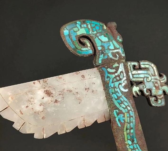 青铜内部分则有两个阑,阑后有木柲痕迹,两面都装饰有兽面纹和鸟纹,并且镶嵌有绿松石片。铜内的造型精致,设计巧妙,工艺精湛,显示出极高的艺术价值