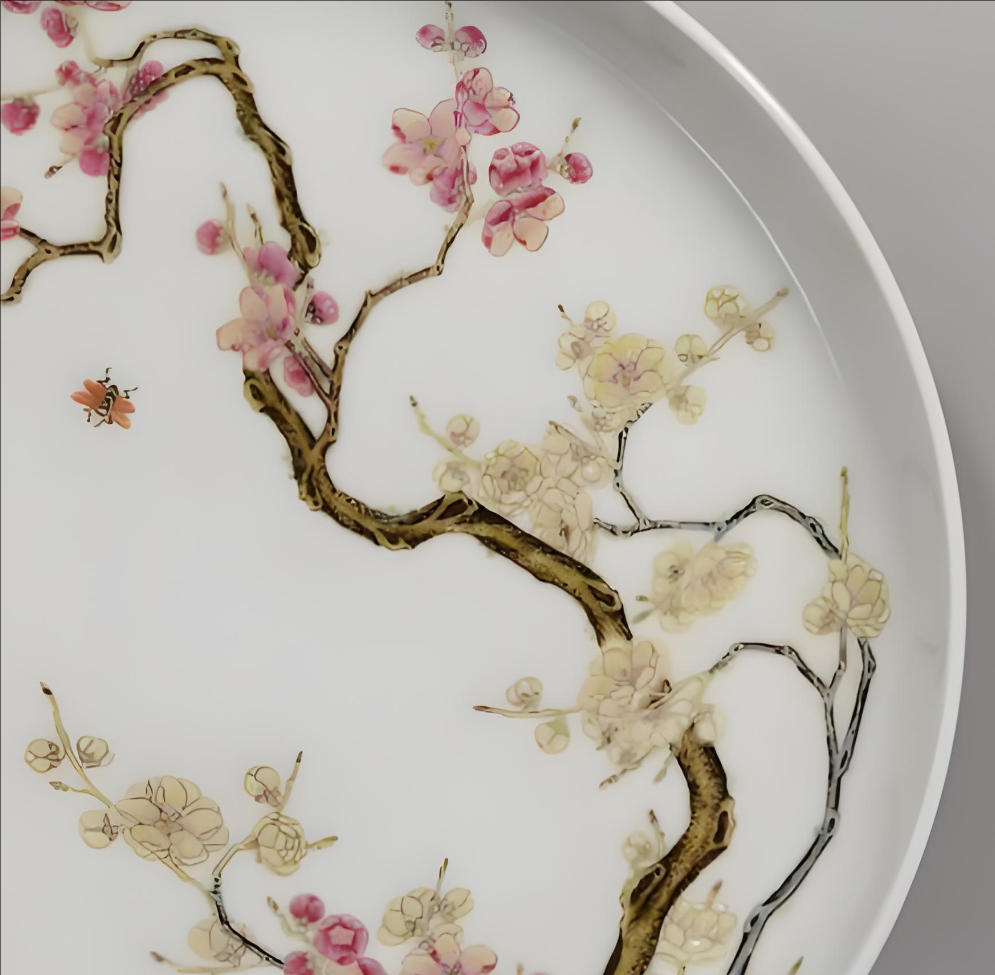此盘为景德镇窑所制,采用清代官窑经典粉彩工艺,以梅树纹为装饰主题。粉彩作为康雍时期的重要瓷器品种,融汇了两朝制瓷精髓,尤以其细腻柔和的彩绘技法闻名于世。