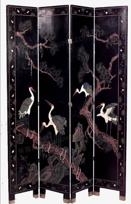 通宽 624 厘米,高 320 厘米,共 12 扇,每扇宽 52 厘米。屏心以黑漆为地,上绘松鹤延年图:苍松盘曲,仙鹤 12 只姿态各异(或展翅、或梳羽、或衔芝),间以祥云、山石、流水。每扇屏额嵌 “康熙辛未年製”(1691 年)款识,边框浮雕缠枝莲纹,屏座雕瑞兽足