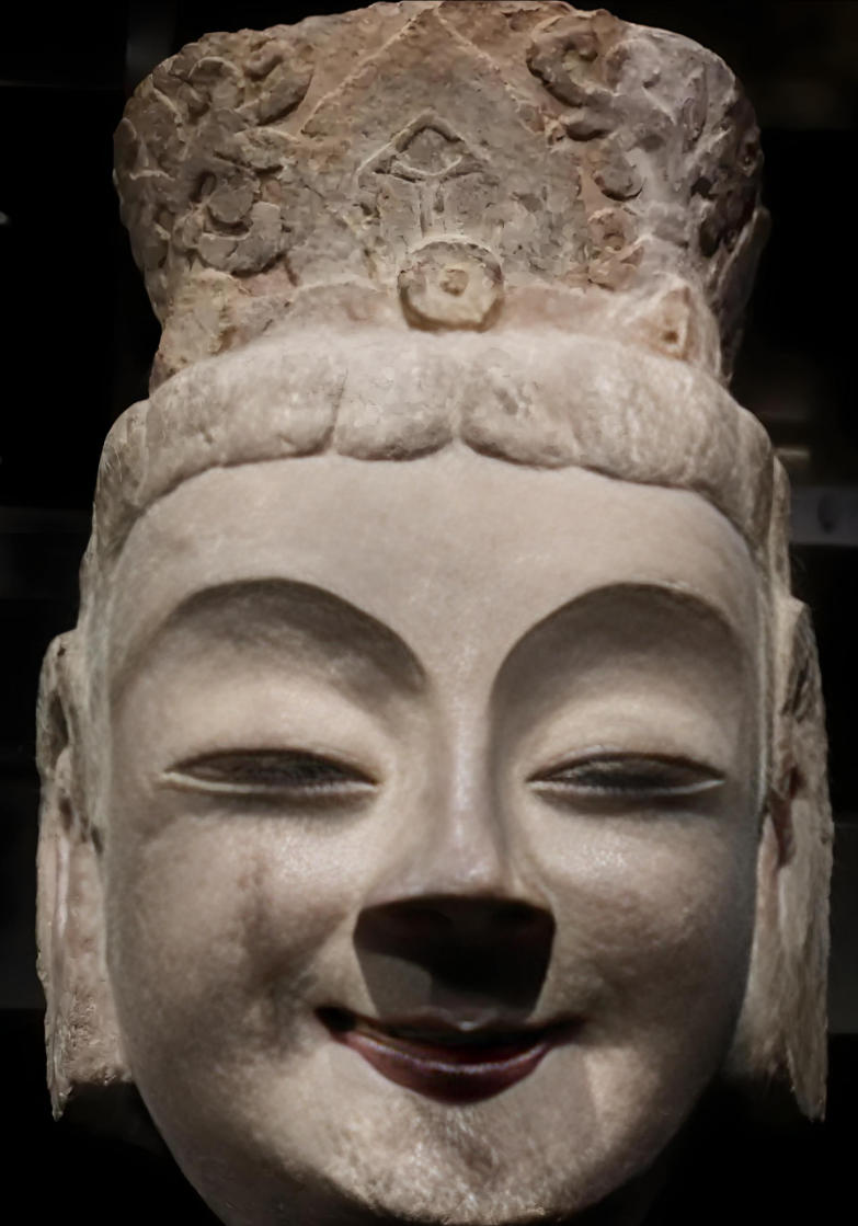 此菩萨头像原为洛阳龙门石窟宾阳中洞内右胁侍菩萨头部。覆斗状华冠,浅浮雕造型简洁浑整。宽额、弯眉上挑、双眼平直,阴线浅刻平雕。目光朦胧,鼻宽短,嘴角上翘内收,神情含蓄,面带微笑。头像造型简洁概括,语言简练,刀工锐利明晰。