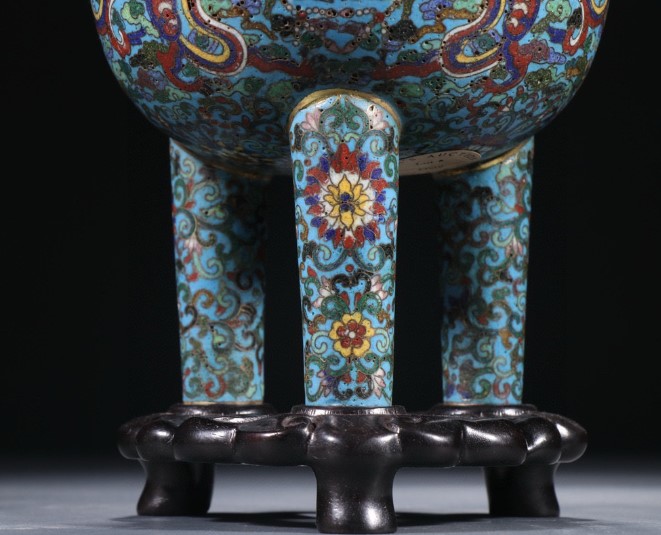 典型器物高约22-86厘米,铜胎鎏金,以蓝色珐琅釉为地。炉身多饰缠枝龙纹,双龙耳作腾跃状,三足为兽首蹄形。盖顶常设盘龙钮,镂空缠枝纹作烟孔,腹部满工掐丝西番莲纹,底部錾刻"乾隆年制"楷书款。釉色鲜艳饱满,金工细腻,尤以龙鳞、花蕊等细节处展现"一件景泰蓝,十件官窑器"的工艺高度