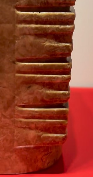 1. 尺寸规格:高 15.8 厘米,上宽 8.2 厘米,下宽 8.5 厘米,孔径 5 厘米,整体呈方柱体,外方内圆,分七节,每节以横槽分隔,上下端平整;
