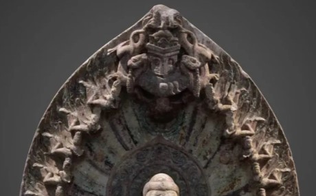 3. 附属元素:台座中央为博山形香炉,两侧各蹲踞一狮,边缘立有供养人(头部已佚失);背屏上部雕刻十二身飞天,两两相对,顶部为翔龙托塔图案,背光处有阴线刻出的光芒线;