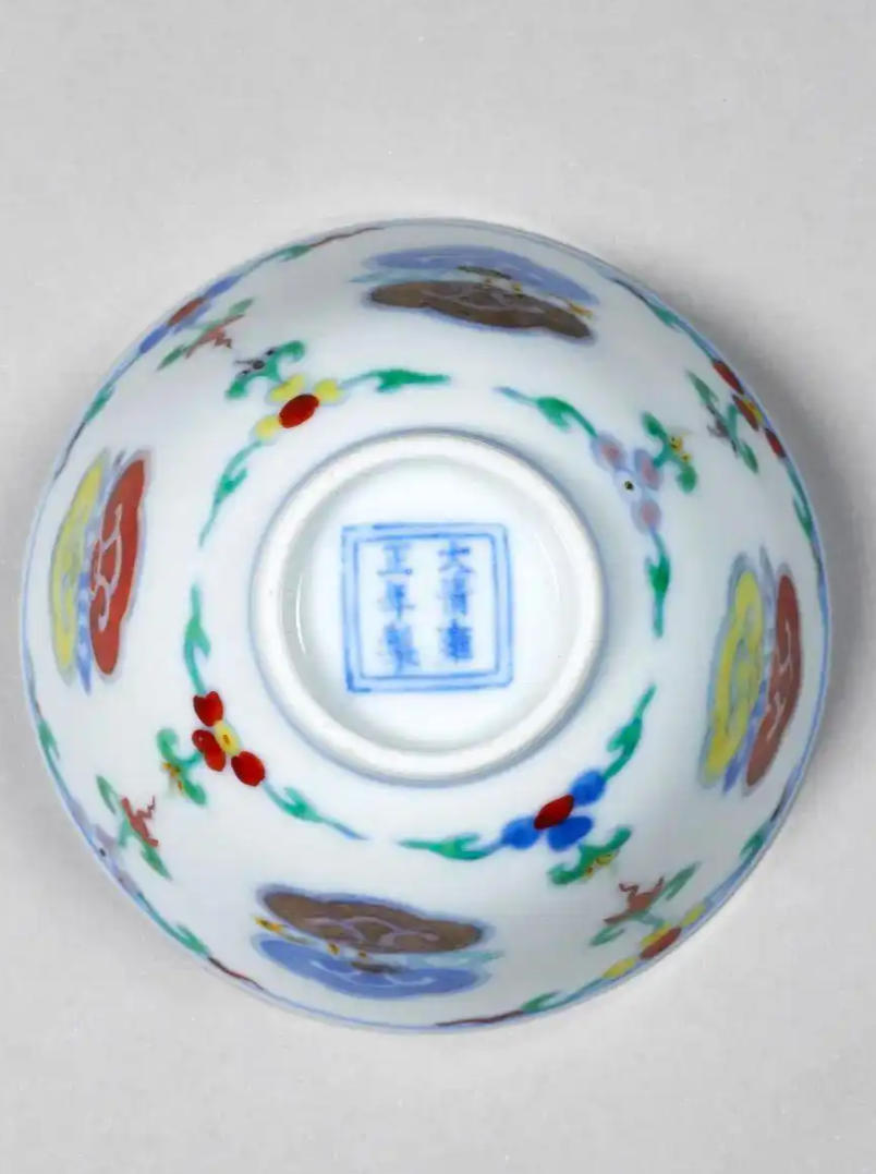 清雍正斗彩灵芝纹杯高4.3厘米,口径7.3厘米,造型秀雅端庄。杯身外壁以斗彩工艺绘四组团状灵芝纹,间饰花草纹样,釉下青花勾勒轮廓,釉上填绘红、绿、黄、紫诸彩,色彩明丽莹润。胎质坚薄细腻,白釉清透温润,底部落"大清雍正年制"六字双行楷书款。其纹饰疏朗有致,绘制精妙流畅,既承袭成化斗彩遗韵,又展现雍正朝瓷器特有的清雅风骨,成对传世尤为珍贵,堪称雍正御窑仿古创新的典范之作。