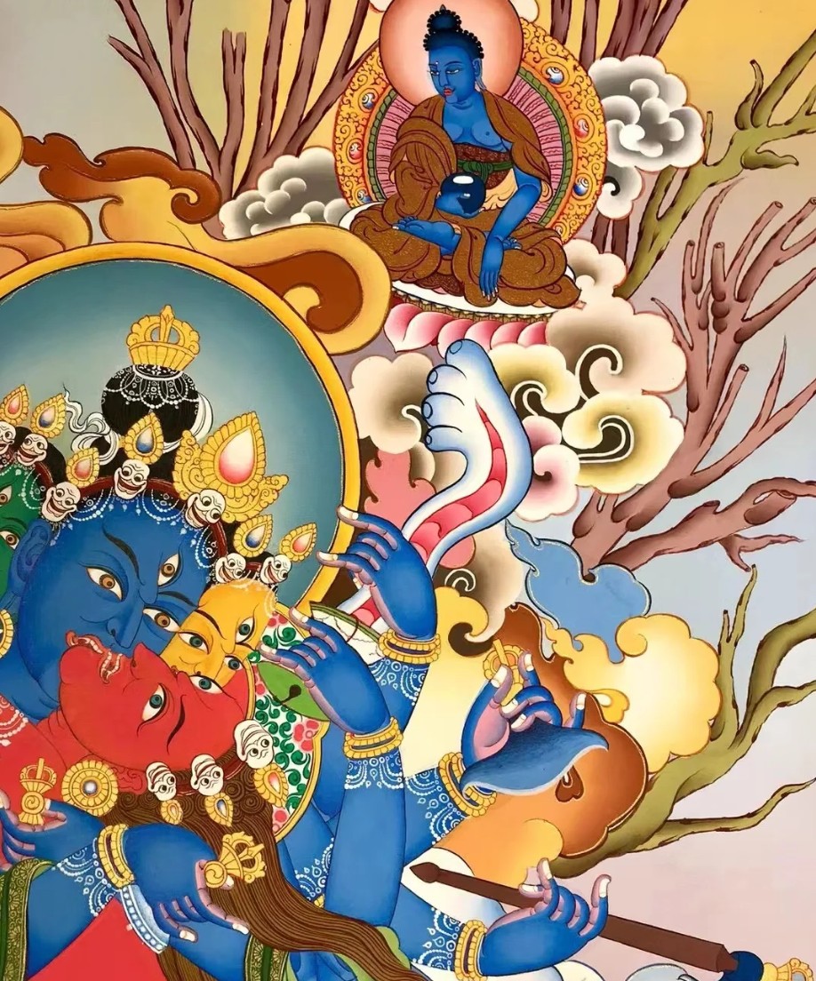 明代永乐织锦唐卡(现存山南博物馆)已体现汉地审美:主尊眉眼含笑,火焰纹简化,题“大明永乐年施”楷书款。此类宫廷赐礼推动西藏本土艺术吸纳丝绸工艺与构图风格