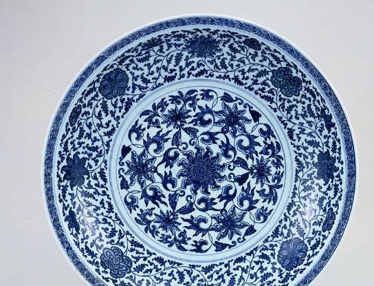 元代景德镇创烧成熟青花瓷,融合伊斯兰审美与中国传统纹样。此类缠枝莲纹盘多经海上丝路销往中东,伊朗、土耳其王室旧藏甚丰,见证了中外文化交流与元代制瓷巅峰成就。