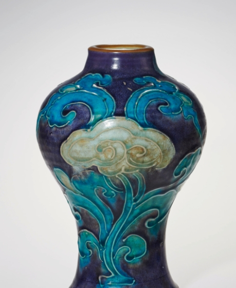 梅瓶修长挺拔(高约30-40cm),肩部丰满,腹部渐收。采用"立粉堆花"技法:以胎泥勾勒缠枝牡丹、八仙等纹饰轮廓,再填施孔雀蓝、茄皮紫、鹅黄等低温釉,釉色明艳如宝石。胎骨灰白疏松,底足露胎处可见明显旋坯痕。