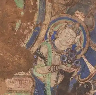 这是克孜尔石窟壁画,展现了佛教题材场景,中央可能是佛陀,周围环绕着菩萨、天人等形象 。壁画运用了龟兹画风,以线条勾勒轮廓,色彩丰富,采用 “凹凸法” 增强立体感。