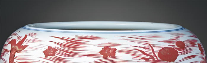 釉里红呈浓红色,通过浓淡不一的色阶和局部留白,细腻地渲染出鱼纹与水藻的层次与动态,展现出极高的工艺水平和艺术价值。此缸不仅体现了康熙时期瓷器制作的精湛技艺,也是当时审美趣味的生动写照。