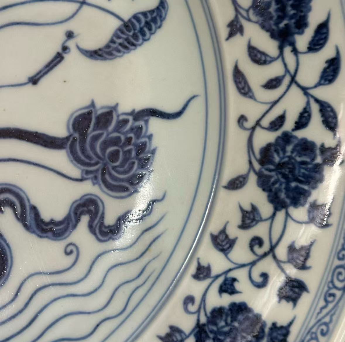 工艺特点:永乐青花以苏麻离青料发色浓艳,晕散自然,盘心绘束莲纹,外壁饰缠枝花卉,直径约35厘米