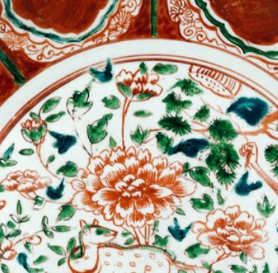 盘心绘有鹿、花卉、树木等图案,鹿寓意吉祥,可能象征福禄。盘边有分区装饰,以红彩为主色调,搭配绿彩等勾勒边框和纹饰, 属明清时期外销瓷风格,体现了当时中国瓷器工艺与海外审美需求的融合。
