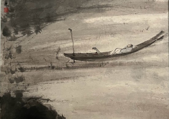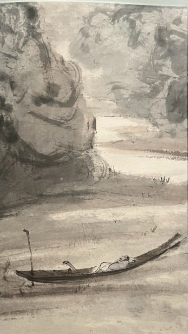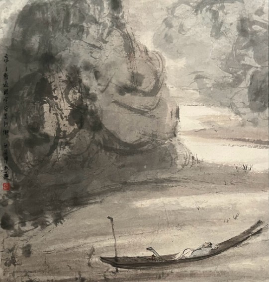 尺寸 94.2 × 57.6 cm;远景以淡墨扫出空阔江天,中景危岩突兀,一高士醉卧扁舟,船篷半掩,人物仅以数笔点写,却神情萧散;