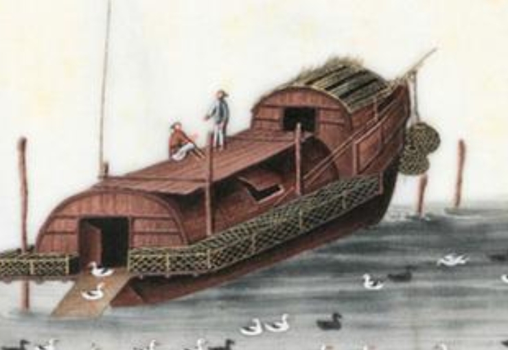 这是一幅中国外销水彩画,以珠江三角洲的鸭船为主题,描绘了一艘专为养鸭和运输鸭设计的船只,画面中两位农夫在船舱顶部交谈。船的竹制平台为封闭式笼状(与另一幅类似作品 4173.12 的开放式平台不同)。作品采用水彩、不透明水彩、墨水绘制,以白色提亮,创作于通草纸(pith paper)上,边缘贴有蓝色丝绸纸,尺寸为高 250 毫米、宽 337 毫米,现处于菲茨威廉博物馆馆藏存储状态。