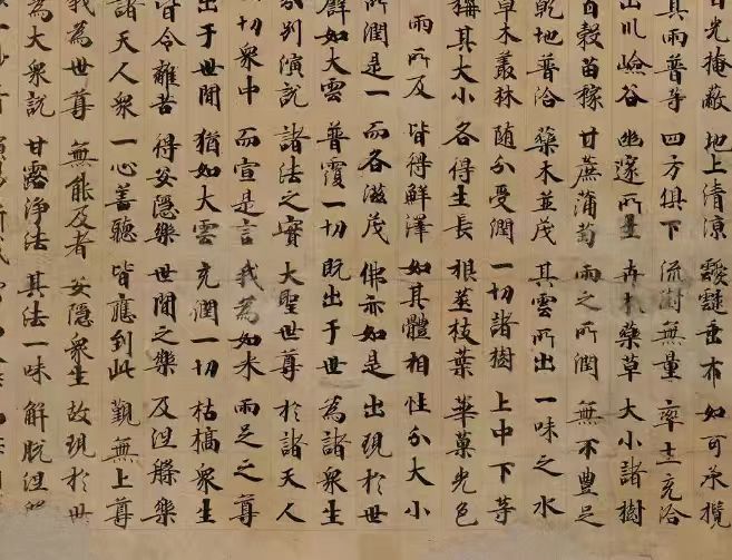此段出自《妙法莲华经》的《授记品第六》与《化城喻品第七》。纸张为传统手工麻纸或皮纸质地,历经岁月侵蚀,整体呈古朴的黄褐色,纸面略有自然磨损、褶皱,部分边缘因长期卷舒出现细微残破。书写方式遵循古代写经规范,以竖排书写,字列整齐有序。墨色历经时光沉淀,呈现出深沉且富有层次的色泽,部分字迹因年代久远、空气氧化等,墨色稍显晕染或变浅,却无损整体文字辨识度。字体为成熟的写经体楷书,笔画规整严谨,横画收放有度,竖画挺拔劲健,撇捺舒展灵动,遵循严谨书写规范,展现出唐代(或对应朝代)写经书法的典型风格