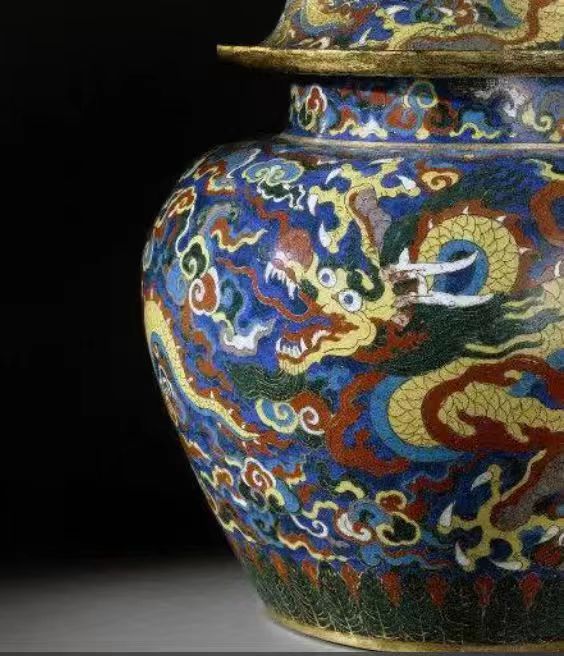 复杂的工艺、明艳的颜色、珍贵的材质,这些都注定了景泰蓝不平凡的出身。当初这种工艺几乎很难在民间见到,只有皇帝、贵族或身处宫廷的人才有机会见到、使用这种珍贵的艺术品。像这件龙纹盖罐就是当年宣德皇帝的御用之物,罐子上不仅有“宣德年制”的款记录了它的制造时间,还另外在颈部有“御用监造”四个字,说明这件罐子是专门为宣德皇帝制作的。
