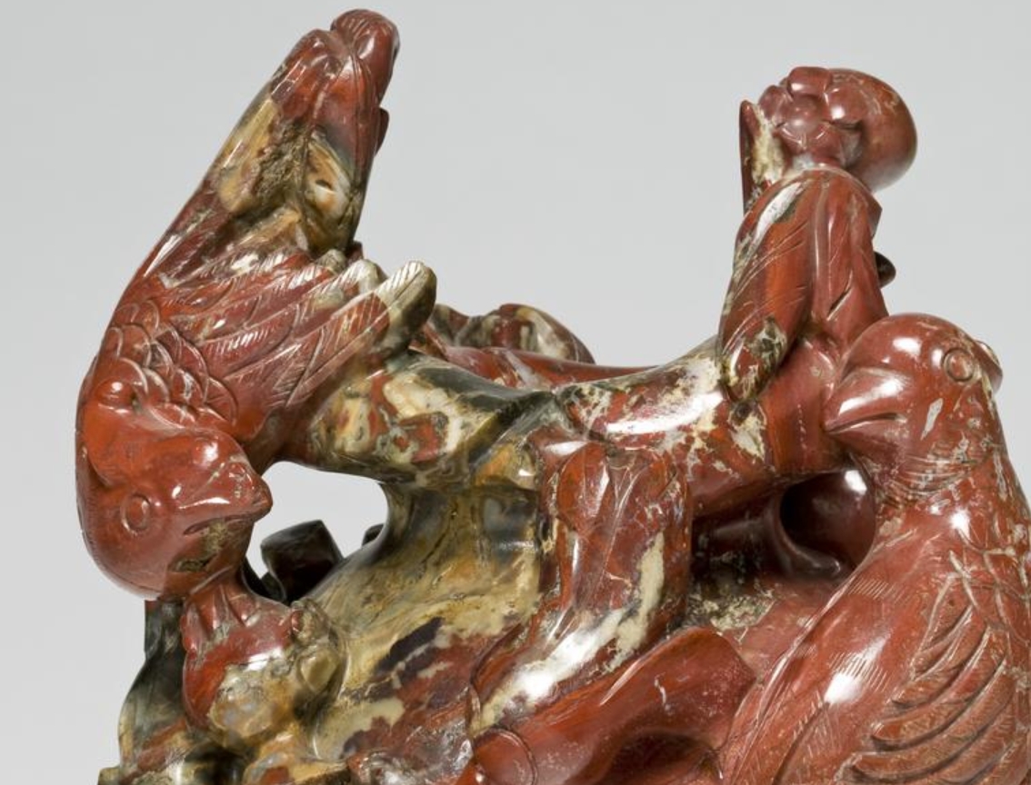 这是一件 19 世纪(1800-1900 年)的玛瑙花瓶,高 15.4 厘米,宽 12 厘米,为陈设用器。瓶体采用玛瑙材质,以圆雕工艺整体雕刻成缠绕的石榴树与两只鸟的造型,枝叶、果实与鸟的形态相互交融,线条流畅自然,细节刻画细腻,展现出对自然生物形态的精准捕捉。玛瑙质地温润,色泽随材质本身的纹理呈现自然变化,雕刻工艺精湛,使造型兼具立体感与生命力。底部阴刻 “乾隆年制”印章款,体现了对清代乾隆时期工艺风格的效仿,兼具艺术观赏性与工艺研究价值。